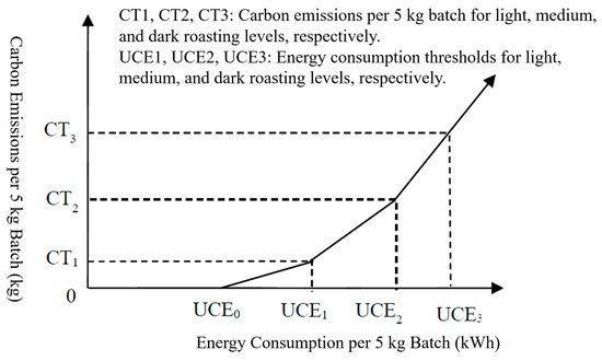 Figure 7 visually represents the correlation between carbon emissions (CT) and energy consumption per unit (UCE) across three levels of coffee bean roasting: Light Roast, Medium Roast, and Dark Roast. The graph employs key symbols to delineate the roasting levels and their associated environmental impact. Vertical axis represents the carbon emissions, measured in kilograms; Horizontal axis represents the energy consumption per unit of production, measured in kWh. Figure 7 illustrates the relationship between energy consumption and carbon dioxide (CO2) emissions across different roasting levels: light roast (UCE1, CT1), medium roast (UCE2, CT2), and dark roast (UCE3, CT3). The x-axis represents cumulative energy consumption per batch (kWh), while the y-axis denotes the corresponding carbon emissions (kg). Both axes now explicitly state that the values are calculated per 5 kg batch. Thresholds (UCE0 → UCE3) and corresponding emissions (CT1 → CT3) are marked to distinguish levels. UCE0 represents the baseline energy consumption before roasting begins. UCE1 corresponds to light roasting, UCE2 to medium roasting, and UCE3 to dark roasting.