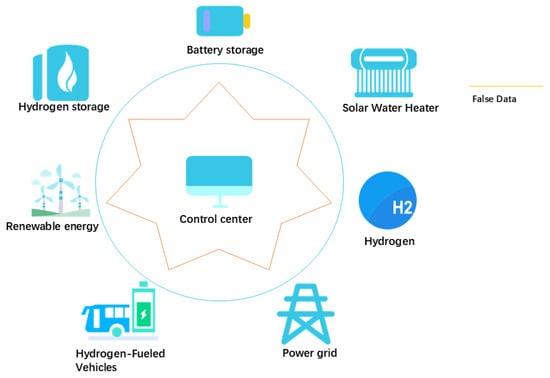 Figure 4 illustrates the topology of the integrated power–hydrogen system, showcasing the key components and their interactions. The system consists of power generation (renewable energy sources such as wind and solar), hydrogen storage, fuel cells, energy storage, and a smart energy system control unit that manages energy distribution. An FDIA is depicted as a cyber vulnerability, showing how manipulated data can affect energy storage and control decisions, leading to system instability and operational disruptions. The arrows indicate the direction of energy flow and cyber interactions, emphasizing how power and hydrogen subsystems are interdependent. This structured diagram provides a clear visualization of the distribution network and its susceptibility to cyberattacks, reinforcing the need for robust security mechanisms in cyber–physical energy systems.
