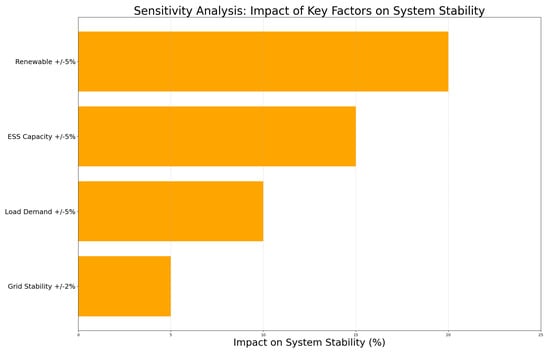 Figure 3 presents the sensitivity analysis of key factors affecting system stability, illustrating the relative impact of changes in renewable penetration, ESS capacity, load demand, and grid stability on the overall system performance. The horizontal bar chart quantifies how variations in these parameters influence system stability, providing insights into their significance. The results indicate that renewable penetration (+/−5%) has the highest impact on system stability, demonstrating a 20% variation, highlighting the importance of managing renewable integration effectively. ESS capacity (+/−5%) follows with a 15% impact, emphasizing its crucial role in stabilizing power–hydrogen interactions. Changes in load demand (+/−5%) contribute a 10% variation, reflecting the sensitivity of the system to fluctuating consumption patterns. Finally, grid stability variations (+/−2%) have a 5% impact, showing a relatively lower but still significant effect on the overall resilience of the system. This analysis provides a clear understanding of how different system parameters influence operational stability, reinforcing the importance of optimizing renewable energy integration, ESS deployment, and grid control strategies to enhance the robustness of the integrated power–hydrogen cyber–physical system.
