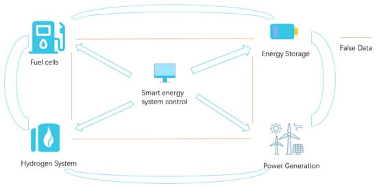 The ESS interacts with the smart energy system control to dynamically adjust energy distribution strategies. Under normal operation, the ESS provides real-time load balancing, but in the presence of cyberattacks, such as False Data Injection Attacks (FDIAs), the ESS serves as a mitigation tool by absorbing abnormal power fluctuations and preventing cascading failures. In this way, the ESS enhances the system’s resilience against cyber threats, maintaining stable operation even when control signals are compromised [13].