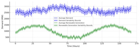 Figure 5 shows average demand and renewable generation (wind + PV) over a one-week period with shaded areas representing variability bounds. Blue represents demand bounds, while green indicates renewable generation bounds, offering a view of possible fluctuations within each day.
