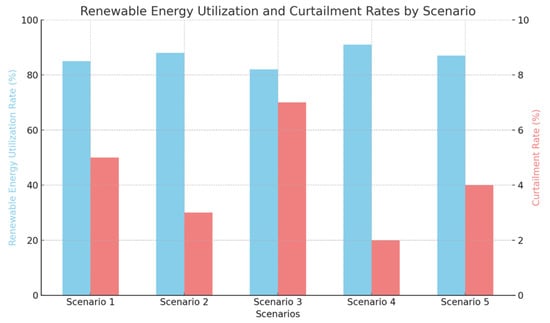 Figure 8 illustrates the comparative analysis of renewable energy utilization and curtailment rates across various scenarios, emphasizing the balance between renewable energy uptake and the inevitable curtailments due to system constraints or overgeneration. Utilization rates, shown on the primary y-axis, represent the effective consumption of available renewable energy, while curtailment rates, shown on the secondary y-axis, indicate the portion of potential energy that is not utilized. For instance, Scenario 1 achieves a high utilization rate of around 85% with a minimal curtailment of approximately 5%, demonstrating an optimal integration level with minimal waste. As we progress through the scenarios, a trend emerges where increased renewable penetration gradually affects curtailment rates. In Scenario 3, for example, while utilization is at a strong 75%, the curtailment rate rises to around 12%. This suggests that as more renewable capacity is added to the grid, particularly in scenarios with wind and solar contributions exceeding 50%, the grid’s limitations in absorbing intermittent energy become evident. This trend provides insights into potential upgrades required in energy storage or demand response systems to manage excess energy. Interestingly, Scenario 5 shows a sharp increase in curtailment, reaching nearly 18%, while utilization dips to around 70%. This scenario likely represents the maximum renewable penetration threshold, indicating a tipping point where the current system configuration cannot efficiently absorb additional renewable energy without curtailment. This analysis suggests that future investments might prioritize enhancing storage solutions or flexible demand systems to mitigate the effects of curtailments, maximizing the overall efficiency of renewable resource utilization across scenarios.