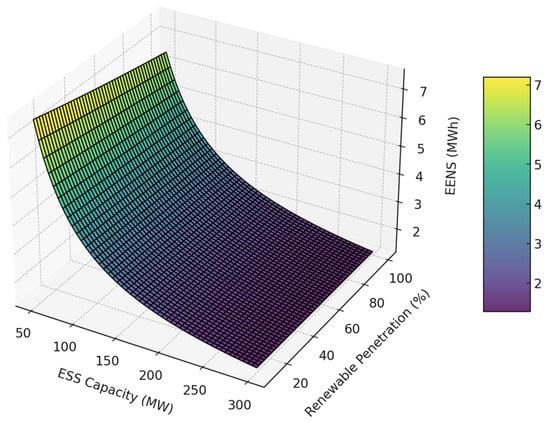Figure 9 illustrates the impact of different levels of ESS capacity and renewable energy penetration on the EENS. On the x-axis, ESS capacity ranges from low to high values, while the y-axis represents renewable penetration levels, from minimal integration to high shares in the system. The z-axis displays the EENS values in megawatt-hours (MWh). Lower EENS values indicate higher system reliability. As shown, increasing ESS capacity significantly decreases EENS, especially when renewable penetration is moderate to high, highlighting the ESS’s ability to stabilize the supply–demand balance amid renewable fluctuations. As ESS capacity increases beyond a moderate level (about 50% of maximum), there is a notable decrease in EENS when renewable penetration levels are moderate (40–60%). However, with lower renewable penetration (below 20%), EENS reduction becomes less responsive to additional ESS capacity, suggesting that high ESS integration might be unnecessary under low renewable scenarios. This outcome indicates that optimal ESS sizing should consider the existing renewable mix, as excessive capacity may not yield proportional reliability gains under low renewable scenarios. At high renewable penetration (above 70%), the model shows a steep decline in EENS as ESS capacity increases, reaching minimal EENS levels when both ESS capacity and renewable penetration are at their peaks. This effect underscores the synergetic impact of the ESS in systems with high renewable shares, where the ESS compensates for intermittency. The ESS’s role in enhancing reliability becomes particularly crucial under high renewable conditions, aligning with the study’s emphasis on the ESS as a strategic investment for resilient and sustainable grid operations.