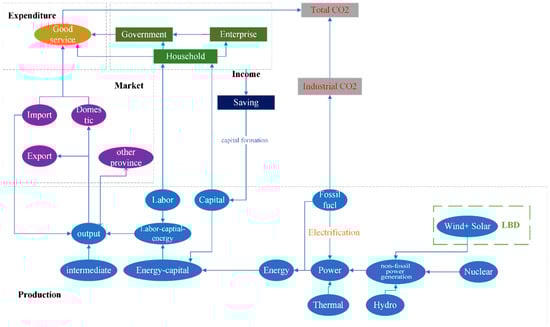 This paper adopts a computable general equilibrium (CGE) model to simulate the Zhejiang province’s economic system, covering production, consumption, market, and final demand. Unlike econometric models that consider the endogeneity of political effects [27], the CGE model helps capture the feedback mechanism within the macroeconomic system [28]. The CGE model allows for the endogenous determination of carbon pricing based on industrial and energy structure, demonstrating the interactive effect between policymaking and carbon abatement. Its basic framework is in line with our past work, which includes a learning-by-doing (LBD) module to account for endogenous technological improvement in RE, as shown in Figure 1 [29]. As a useful tool to describe economic systems under policy shocks, the CGE model effectively evaluates the policy impacts.