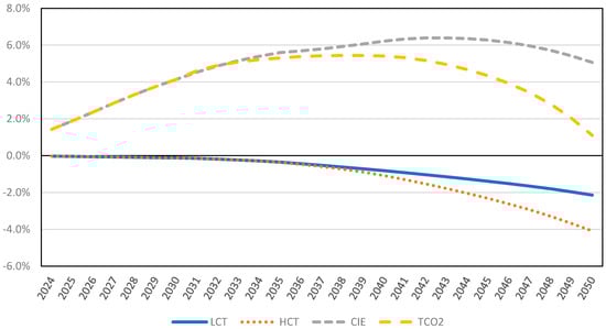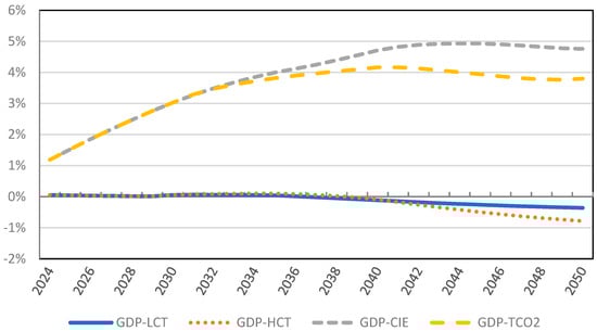 Figure 2 demonstrates the GDP gains in CIE and TCO2 scenarios and GDP losses in the LCT and HCT scenarios. The exogenously implemented carbon tax in the LCT and HCT scenarios has a slight but positive impact on GDP growth in the medium term, ranging from 0.1% to 0.01%. A higher carbon tax results in a greater GDP growth rate than a lower one during this period. However, the GDP decreases significantly in the long term, where the higher the carbon tax, the severer the negative impact.
