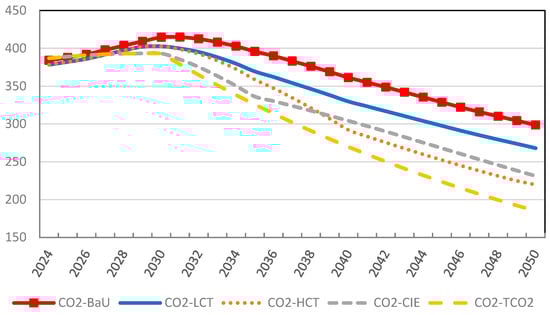 The carbon tax in the LCT scenario refers to the current level of carbon tax implemented in Europe [39]. In the HCT scenario, the carbon tax is similar to the carbon price in the CIE scenario, which will be discussed in the next section. The carbon intensity decline rates in the CIE scenario are set as 5%, 6.2%, and 4% for the periods 2024–2030, 2031–2035, and 2036–2050, respectively. The exogenously determined carbon emissions in the TCO2 scenario are based on the Opinions on Promoting Energy Consumption Dual control to Gradually Shift towards Carbon Emission Dual Control from the Central Committee for Comprehensive Deepening of Reform (CCCDR) (https://www.mee.gov.cn/xxgk2018/xxgk/xxgk13/202311/t20231106_1055201.html, accessed on 1 January 2025). In addition, carbon intensity is exogenously designed until 2035, while carbon emissions are set exogenously from 2035 to 2050 in the TCO2 scenario, aiming to compare different pathways to long-term carbon neutrality. In the following sections, the carbon tax will be used in the LCT and HCT scenarios, while carbon prices will be derived from the CIE and TCO2 scenarios for carbon abatement, differentiating exogenous carbon taxes and endogenous carbon prices.