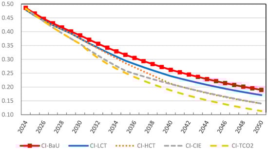 Carbon intensity (CI) in each scenario (unit: ton/yuan).