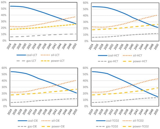 In the long term, a slight rebound effect is observed in the carbon intensity of the tertiary industry, with an annual growth rate range from 0.87% to 1.22% between 2036 and 2050. In contrast, the infrastructure industry shows a significant decline in sectoral carbon intensity, ranging from −3.0% to −4.7% over the same period. As shown in Figure 4, the long-term decline in total carbon intensity is driven by energy efficiency improvements in the infrastructure industry, especially the power sector. This suggests that while the energy efficiency of heavy and light manufacturing industries declines, its negative impact is offset by an industrial transition from high-emission to cleaner sectors. The primary driver of carbon emissions reduction remains the decline in coal consumption, as shown in Figure 5. However, the share of primary electricity (RE and imported electricity) remains largely unaffected by low-carbon policy, compared to the 25.8% share seen in the BaU scenario, as discussed in Section 6.2. This indicates that despite changes in the local power supply structure due to policy interventions, the low-carbon policies implemented in the Zhejiang province in this study have not significantly promoted RE development as a substitute for thermal power compared to the BaU scenario.