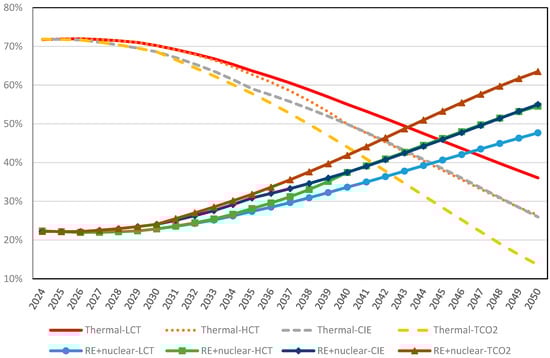 By further comparing the two types of power generation in Figure 6, we find a significant decline in thermal power generation alongside the promotion of RE and nuclear power development. The results shown in Figure 5 further explain those in Figure 6, indicating that the phase-out of thermal power is fully offset by the growth of RE and nuclear power. A stricter carbon tax generally exerts a stronger negative impact on thermal power development, while an even stricter carbon emission reduction target imposes the strongest impact on the phase-out of thermal power. This is because thermal power is one of the largest CO2 emitters but can be replaced by clean energy such as RE.