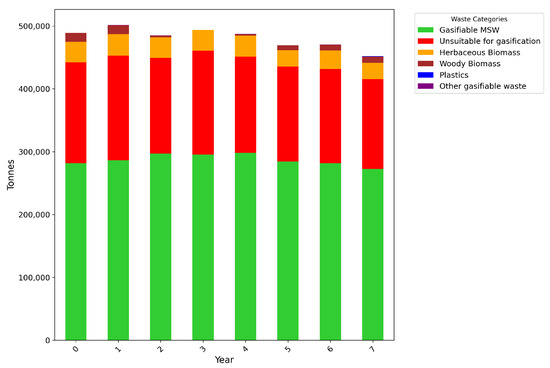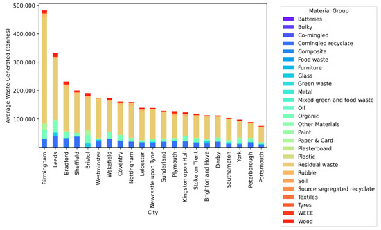 The material composition analysis of waste from 21 UK cities between 2016 and 2022, based on the Q100 dataset, reveals the variations in the type and volume of waste generated. As shown in Figure 3, Birmingham generates the highest tonnage of waste compared to other cities included in the analysis, with a substantial proportion being gasifiable materials suitable for energy recovery—primarily residual waste, which represents the MSW targeted in this study. Notably, cities like Manchester and London, which were also expected to generate more waste due to their larger populations, were excluded from this analysis due to inconsistencies in their local authority waste generation datasets. While this high tonnage of waste is expected for the most populated city in the study, Birmingham’s material breakdown highlights its strong potential to leverage MSW gasification technologies.