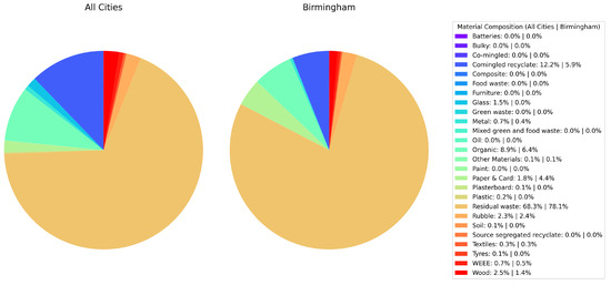 Visibly, Birmingham also exhibits lower percentages in other categories, such as co-mingled recyclate (5.9% in Birmingham compared to 12.2% across all cities) and organic waste (6.4% vs. 8.9%). These may suggest a lower emphasis on recycling and organic waste separation; practices typically represented by the green and blue kerbside bins for UK households—which could suggest areas for improvement.
