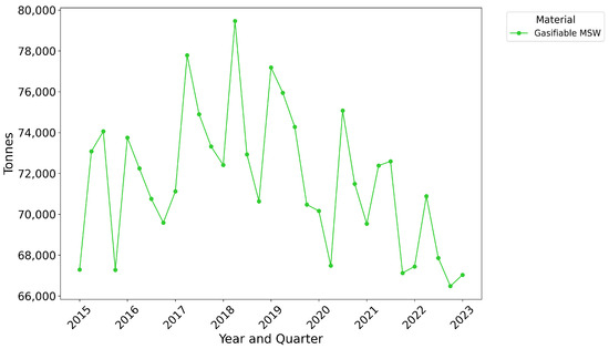 Figure 7 illustrates the seasonal and quarterly variation in MSW collected by local authority in Birmingham from 2015 to early 2023. Waste peaks during the winter months, particularly in 2017, 2018, and 2019, likely driven by increased consumption and holiday-related waste generation. These peaks align with the UK’s higher heat demand in winter [45], highlighting the potential for EfW systems, such as gasification, to support Birmingham’s energy strategy through the availability of waste feedstock with seasonal energy demands.