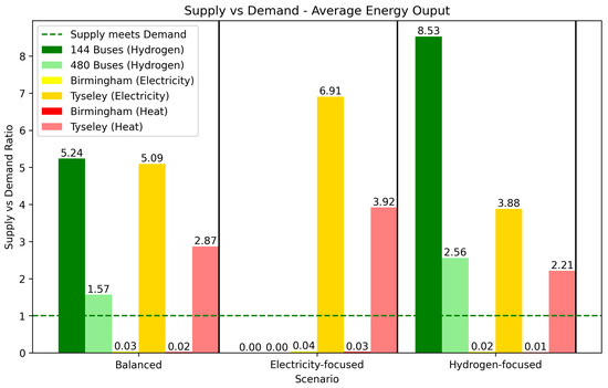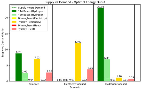 The balanced scenario offers Birmingham the most versatile approach, providing moderate coverage across hydrogen, electricity, and heat demands. While it does not maximise any single energy vector, it provides flexibility to adapt to fluctuating urban energy needs. This adaptability is felt to be increasing in value in urban energy systems where demand changes across time and vector.
