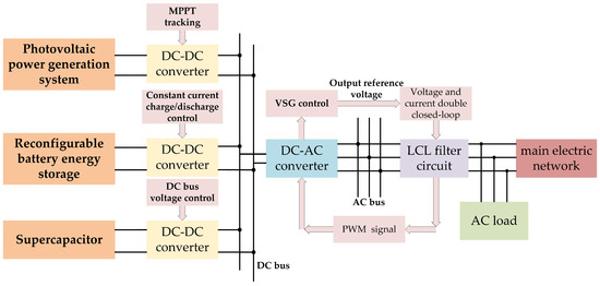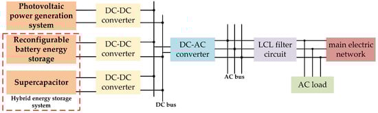 To fully utilize the advantages of reconfigurable energy storage and the characteristics of capacitors, this study introduces a power coordination control strategy grounded in reconfigurable energy storage, extending the work of literatures [6,7]. The proposed approach seeks to enhance system reliability and stability while prolonging battery cycle life. Firstly, a new reconfigurable microgrid system is proposed, consisting of energy storage, photovoltaic cells, and supercapacitors. A hybrid topology combining reconfigurable energy storage and supercapacitors is employed as the energy storage solution for the photovoltaic system. Secondly, an innovative control approach is proposed for the reconfigurable energy storage, photovoltaic units, and supercapacitors. The reconfigurable energy storage achieves constant current charge/discharge control through a DC–DC converter, while the supercapacitor maintains DC bus voltage stability via another DC–DC converter. Then, when fluctuations occur in photovoltaic power or load power, the energy storage’s output power is dynamically regulated by leveraging the reconfigurable battery network’s adaptive characteristics. Simultaneously, the high power density characteristics of the supercapacitor compensate for power mutations caused by the adaptive reconfiguration mechanism. Finally, a simulation model is constructed in the MATLAB/Simulink environment to validate the efficacy and practicality of the proposed control approach.