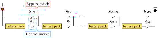To address the limitations of fixed series–parallel topology in traditional battery energy storage systems, a new reconfigurable battery network based on a switch-bypass architecture is adopted, and the network structure is schematically represented in Figure 2. The network consists of M battery packs connected in series, each of which is connected in series with a control switch Si and in parallel with a bypass switch SiN. During operation, the battery packs are controlled to be connected to or isolated from the charge–discharge network via the switches. The proposed strategy dynamically regulates the charging/discharging durations of individual battery units, effectively mitigating SOC disparities between modules while extending the cycle life of the energy storage system.