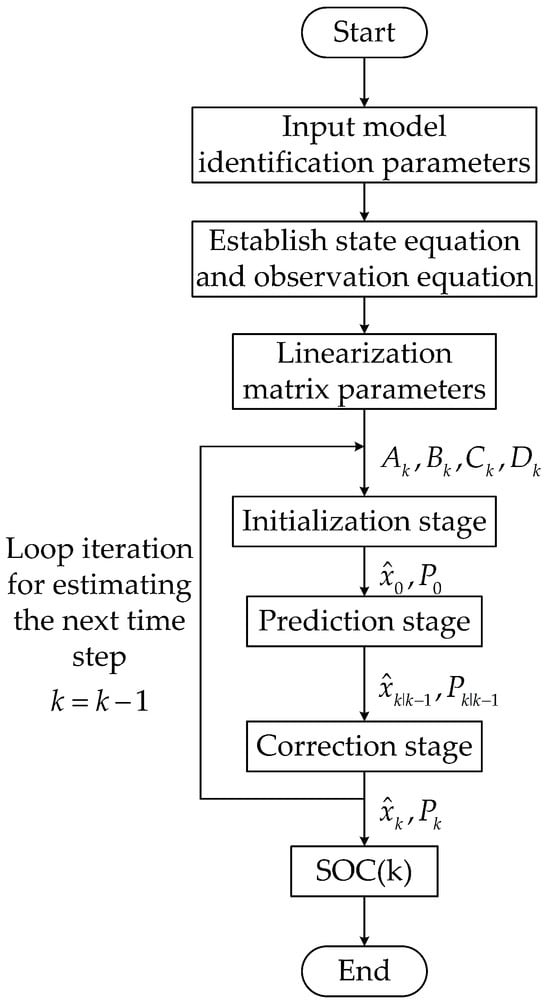 The extended Kalman filtering (EKF) algorithm implementation for battery SOC estimation, depicted in Figure 4, initiates with mathematical model formulation through second-order RC network parameterization and coulombic integration principles. Subsequent computational stages involve nonlinear system linearization via Taylor series approximation, followed by recursive state variable prediction–correction cycles derived from Kalman filtering theory, ultimately yielding precise electrochemical state quantification for the energy storage module.