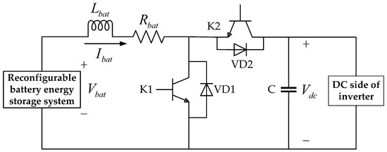 A reconfigurable battery energy storage system adjusts the output voltage through the series circuit and achieves constant current charge/discharge operation via the DC–DC converter [24,25]. The DC–DC conversion circuit structure is shown in Figure 6, where, is the output voltage of the reconfigurable battery energy storage system; is the energy storage inductance; is the discharge current of the reconfigurable battery energy storage; K1 and K2 are high-frequency power electronic switches; VD1 and VD2 are freewheeling diodes; C is the filter capacitor; is the DC bus voltage.