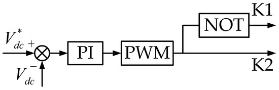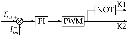 PI control mode is adopted for energy storage constant current charge/discharge, and the control principle is illustrated in Figure 7. In the figure, represents the expected discharge current, which is negative during charging and positive during discharging; NOT denotes the logical negation sign, indicating that the on–off state of switch K1 is opposite to that of switch K2.