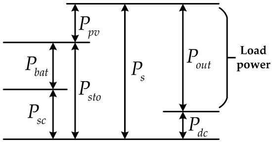 where is the sum of the power generation unit (including photovoltaic and hybrid energy storage); is the output power of the inverter (load power); is the power required to keep the DC bus voltage stable; is the output power of the photovoltaic power generation system; is the output power of the hybrid energy storage system; is the output power of the reconfigurable battery energy storage system; is the output power of the supercapacitor; s is the differential element; is the low-pass filter element; is the time constant.