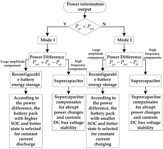 Based on the above analysis, the reconfigurable battery storage selects the appropriate battery pack for constant current charge/discharge according to the power difference, compensating for the larger power amplitude component. Meanwhile, the supercapacitor utilizes its high power density characteristic to compensate for the power fluctuations caused by the battery pack reconfiguration process. The specific working logic of the microgrid system is shown in Figure 10.