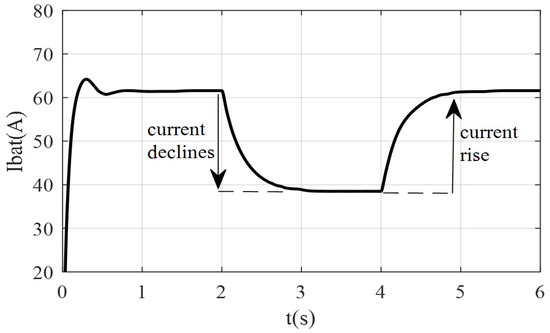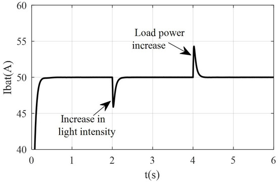 From Figure 11, the observations confirm that when the photovoltaic power generation increases at 2 s while the load demand power remains unchanged, the discharge current of the traditional battery energy storage decreases from 61.6 A to 38.5 A. Similarly, when the photovoltaic power generation remains unchanged at 4 s and the load demand power increases, the discharge current of the traditional battery energy storage decreases from 61.6 A to 38.5 A. This indicates that the current of the traditional battery energy storage fluctuates significantly during the entire operation process, which will severely reduce the battery lifespan. From Figure 12, it can be seen that the discharge current of the reconfigurable battery energy storage remains positive and stable at 50 A, indicating that the reconfigurable battery energy storage system operates in a constant current discharge state. This effectively addresses the issue of battery lifespan degradation caused by continuously varying charge/discharge currents when traditional energy storage compensates for photovoltaic power.