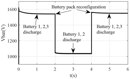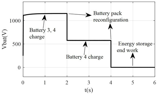 Figure 13 and Table 2 demonstrate that during 0∼2 s, reconfigurable battery energy storage controls battery packs 1, 2, and 3 with larger SOC to discharge together, and the series output voltage is about 1540 V; during 2∼4 s, due to the increase in illumination intensity, photovoltaic power generation power increases, energy storage controls battery packs 1 and 2 to discharge together through switches, and the output voltage decreases from 1540 V to 1038 V; during 4∼6 s, because the AC load demand power increases to 175 kW, the energy storage system continues to reconfigure at 4 s, and the output voltage increases from 1038 V to 1540 V by controlling battery packs 1, 2, and 3 to discharge together through switches.