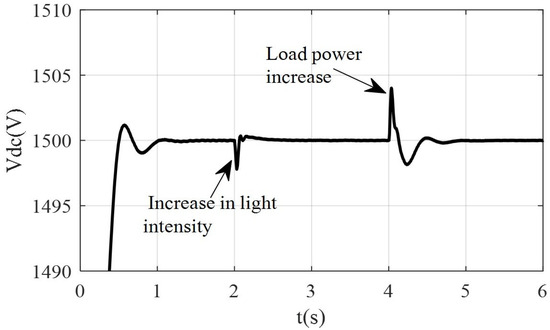 Condition 1: The photovoltaic generation initially operates below load demand levels, with irradiance set at 700 W/m2 and AC load at 150 kW. At t = 2 s, irradiance experiences a step increase to 900 W/m2, followed by a load demand surge to 175 kW at t = 4 s.