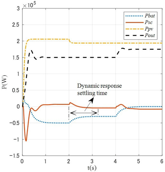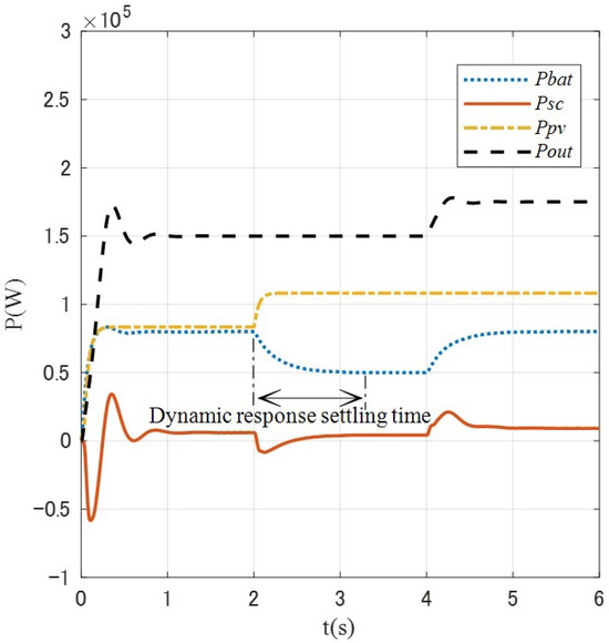 By comparing Figure 15 and Figure 16, the observations confirm that the output power of the microgrid system under both control strategies stabilizes at 150 kW and 175 kW, meeting the load power demand. However, the dynamic response stabilization time for the traditional battery energy storage control strategy is approximately 1.25 s, whereas for the reconfigurable battery energy storage control strategy, it is about 0.2 s. This indicates that the dynamic performance of the reconfigurable battery energy storage control strategy is superior to that of the traditional control strategy. It can be seen from Figure 16 that in the whole simulation stage, the output power of each unit in the microgrid is conserved, i.e., , wherein the reconfigurable battery energy storage compensates for the component with larger amplitude of the power difference (the difference between the load demand power and the photovoltaic power generation power, i.e., ), and the supercapacitor compensates for the component with smaller amplitude of the power difference and simultaneously compensates for the power mutation caused by the battery reconfiguration process by using the high power density characteristic.