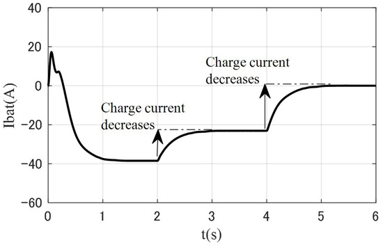 From Figure 17, the observations confirm that when the photovoltaic power is reduced at 2 s while the load demand power remains unchanged, the charging current of the traditional battery energy storage decreases from 38.5 A to 23.1 A. Similarly, when the photovoltaic power remains unchanged at 4 s and the load demand power increases, the discharge current of the traditional battery energy storage decreases from 23.1 A to 0 A. This indicates that the current of the traditional battery energy storage fluctuates significantly during the entire operation process, which will severely reduce the battery lifespan. From Figure 18, it can be seen that the discharge current of the reconfigurable battery energy storage remains negative and stable at 50 A, indicating that the reconfigurable battery energy storage system operates in a constant current charging state. This effectively addresses the issue of battery lifespan degradation caused by continuously varying charge/discharge currents when traditional energy storage compensates for photovoltaic power.