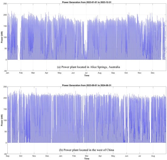 Intermittent power generation records of photovoltaic power plants: (a) power plant located in Alice Springs, Australia; (b) power plant located in western China.