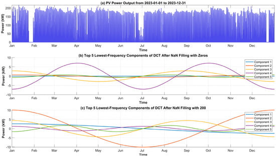 DCT Results of power generation records: (a) original power generation of power plant located in Alice Springs, Australia; (b) first 5 low-frequency components after NAN filled with zero; (c) first 5 low-frequency components after NAN filled with 200.