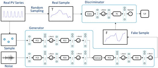 Traditional GANs, which were initially designed for image generation, use noise as input data for the generator. Conditional GANs were later introduced by incorporating label information into the generator’s input. Unlike image data, PV power generation records are time series with temporal dependencies. To address this, our proposed GAN architecture incorporates historical data as auxiliary input to enhance the quality of generated data. Furthermore, since PV power generation data are generally positive, with negative values being minimal, the Generator employs a Leaky ReLU activation function instead of the conventional Tanh function.