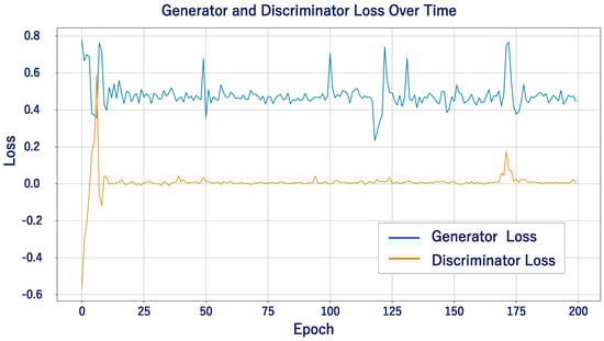 It is readily seen from Figure 4 that the discriminator loss remains relatively low and stable after the initial training phase, indicating that it effectively distinguishes real from generated samples without overfitting. Meanwhile, the generator loss significantly fluctuates in the initial phase but stabilizes as training progresses. This indicates that the generator is learning to produce more realistic outputs, gradually reducing the discrepancy between generated and real data.