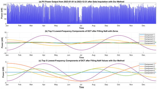 To analyze the characteristics of PV generation data, we conducted a Discrete Cosine Transform (DCT) analysis. For comparison, missing values in the solar power output data were filled with 0 (minimum) and 200 (near-maximum). Figure 2a presents the DCT results for 2023 PV generation data from the DKA Solar Centre, while Figure 2b,c show the top five low-frequency components after filling with 0 and 200, respectively. From them, it is apparent that the amplitudes of different frequency components vary depending on the filled value, which highlights that different imputation methods can alter data patterns, potentially distorting PV predictions and leading to errors.