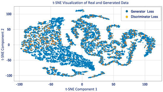 In our study, t-SNE compares real and generated data to evaluate how well the generator learns the real data distribution. If the two datasets are well separated, it suggests poor generation quality, whereas significant overlap indicates effective learning and high-quality synthetic data.