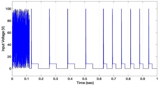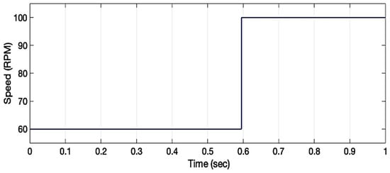 The sampling time for the control system is set to 100 µs. The algorithm is initialized with a stabilizing voltage signal, with the first value of the current defined as , and control gains are . The value function is configured with the parameters Q = 100 and R = 0.001, while the Reward decay factor is set to = 0.7. An augmented current generator supplies a sequence of pulses with a peak level of 4A. At each NNs node, the algorithm collects 12 data groups from the machine’s operation to train the NNs-grid. The proposed algorithm has been tested for cubic NNs-matrixes to highlight the differences in performance and response. It is important to note that without the implementation of the cubical estimation algorithm, any modification to the mechanical speed would require a retraining process to adapt the system to the new speed level. This additional training introduces computational overhead and delays, making real-time adjustments challenging. The cubical estimation algorithm has been integrated into the control framework to overcome this limitation, allowing speed adjustments to be handled externally from the model. By decoupling speed adaptation from the learning process, this approach eliminates the need for repeated training, enhancing system efficiency, responsiveness, and overall performance in dynamic operating conditions. In this test, the cubic NNs-matrix was implemented. When the motor’s speed of spinning increased from 60 to 100 RPM, as illustrated in Figure 3, the system responded rapidly, with the speed remaining stable throughout the training procedure. Unlike the flat NNs-matrix, the NNs-matrices in the cubic NNs-matrix did not require re-training at 0.6 s due to the inclusion of the speed axis. Figure 4 illustrates the input control voltage applied to the motor both during the tuning phase and after the system has been completely optimized. The speed adjustment behavior of the proposed system is demonstrated in Figure 5. Once the algorithm is initialized and the NNs-matrix has adapted to the system range, the algorithm utilizes the points corresponding to the measured speed. Resultantly, at a certain specific speed, the algorithm selects the optimal weight values directly from the table, eliminating the need for further re-training.
