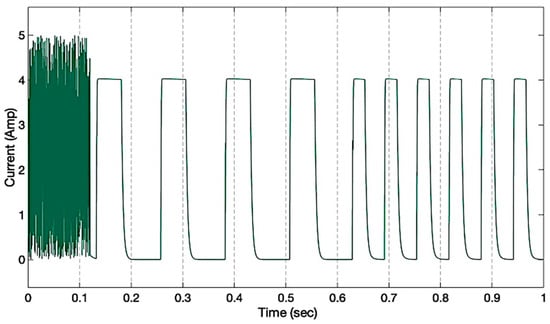 In this context, represents the reference current trajectory, while denotes the reference current generator capable of producing a continuous sequence of pulses that forms the objective path of the current. This augmented model is combined into the framework of the machine. For each phase, the DC voltage injected into the winding results from the sum of the voltage drop and the time-varying inductance coils. Consequently, the enhanced model of the machine can be formulated as follows: