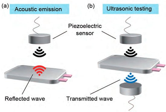 As a non-destructive testing method, acoustic sensing technology has the characteristics of strong penetration, non-destructiveness, and high sensitivity and has been widely used in medical, industrial, and architectural fields [28]. The essence of sound waves is mechanical waves, which are a form of periodic mechanical vibration propagation in a medium. When the sound wave passes through the object and interacts with it, the characteristic information such as sound velocity, attenuation, and frequency reflected by the object after passing through the object can be observed and measured, and the changes in the elastic modulus, internal stress and other parameters of the object material can be obtained, and then the material properties and internal structure can be accurately evaluated. According to these characteristics of acoustic sensing, only a probe needs to be placed outside the battery to detect the internal structure of the battery and obtain the internal information of the battery, which fundamentally solves the difficulties encountered by implantable sensors and is an ideal non-destructive monitoring method of batteries [29]. The principle of acoustic sensing can be divided into two categories: acoustic emission (AE) testing and ultrasonic testing (UT) (Figure 1); the differences are shown in Table 2.
