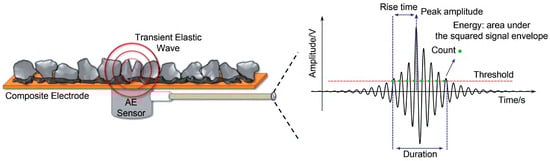 In addition to the degradation mechanism of the electrolyte, the mechanical evolution of the electrode often leads to a fracture event and the corresponding energy release. Therefore, the sound waves emitted by these events depend on the intrinsic properties of the material (crystal structure, grain size, phase transition, etc.), as well as the stresses generated during cycling [30,31], as shown in Figure 3. Therefore, AE characterization, being a non-destructive and passive technique, is particularly suitable for monitoring electrode materials that undergo phase transitions and repeatedly expand and contract during cycling. This results in various types of cracks and locations within the material. AE is extensively used in civil engineering for the early detection of damage, such as cracks and fatigue, in concrete structures. Additionally, it is applied in the aerospace sector to facilitate predictive maintenance by mapping strains in aerospace components.