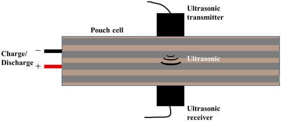Compared with AE technology, UT technology is an active detection technology and is more widely used. Figure 4 is a schematic diagram of LIB ultrasonic transmission testing [37], in which the stress wave excited by the ultrasonic emitter propagates in the material, undergoes reflection, attenuation, transmission, and other behaviors, is received by the ultrasonic receiver, and then the transmitted or reflected ultrasonic signal (such as the time of flight (TOF) and the peak of the first echo detected by the ultrasonic wave) is analyzed to accurately evaluate the structural changes and defects inside the material. Therefore, UT technology can reflect the changing structure and possible defects during battery cycling in real-time so that important parameters related to the battery state can be obtained [38], which can be used to detect internal damage in the battery [39], interlayer gas accumulation [40], and electrolyte wetting [41].
