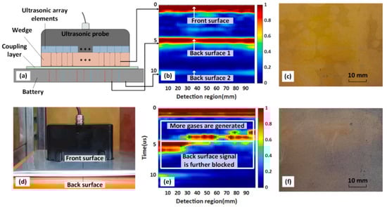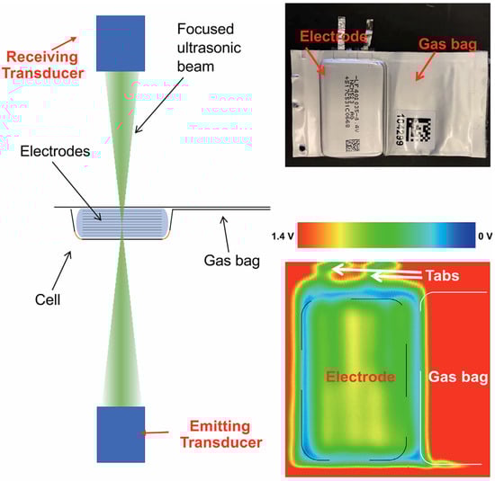 In the past decade, many researchers have used UT technology to monitor various battery systems and developed a series of methods to explore the battery state using ultrasonic technology. Huang et al. [41] used a focused ultrasonic beam to accurately scan the battery and detect electrolyte wetting in square and pouch cells using the inconsistencies of the ultrasonic signal attenuation in solids, liquids, and gases (Figure 5). While analyzing the changes in transmittance of different batteries, it can also quickly determine the minimum electrolyte injection amount and wetting time, which can accurately image the electrolyte distribution and gas production of the battery, which is of great significance for the process optimization in the actual battery production process. At present, this technology has been widely used in the study of battery gas production [42,43] and electrode-electrolyte interface [44].