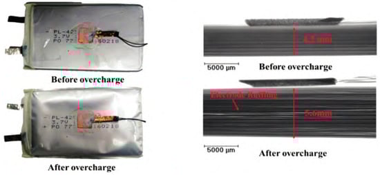 Oca et al. [73] measured the SA and TOF of the ultrasonic signal and found that during light overcharging, the SA began to decrease, and the TOF began to increase, while the battery voltage and temperature did not change significantly. Wu et al. [74] studied the voltage, current, temperature, and ultrasonic signals of the pouch LIB in the overcharged state and found that the overcharging of the battery led to a change in the internal electrode interface and an increase in the macroscopic thickness of the battery (Figure 8), when the TOF and the first echo peak increased rapidly, indicating the overcharge state of the battery before the battery expanded, thereby assessing the degradation of the battery, and demonstrating the effectiveness of ultrasound in monitoring the risk of electrical abuse. Copley et al. [75] found that the correlation between ultrasonic response and battery capacity is stronger than that between voltage and capacity and that the change in battery capacity during charging can be tracked by selecting the peak sound wave, effectively preventing the occurrence of battery overcharging.