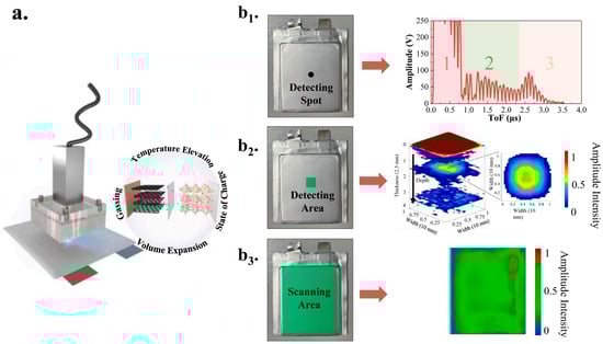 The schematic diagram and the detecting outcome of ultrasonic detecting techniques [83]. (a) The diagram of the ultrasonic detection in pouch cells. (b1) The ultrasonic wave obtained by A-scan techniques. (b2) Three-dimensional TFM ultrasonic reflection patterns. (b3) Two-dimensional TFM image throughout the whole cell.