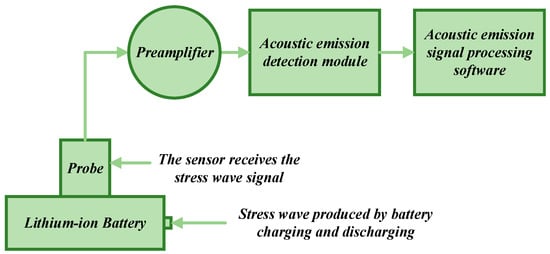 Kai Zhang et al. [84] set up an AE measurement platform for LIBS (Figure 11) and set up a LIB cyclic experiment to analyze the stress wave signal of LIBs, and obtained two stress wave signals that can characterize the SOH of lithium-ion batteries: continuous AE signal and pulsed AE signal. The experimental results show that the amplitude of the continuous AE signal decreases with the increase in the number of battery cycles during the discharge process, which can be used to characterize the degradation of battery performance. The pulsed AE signal is more at the first cycle of the battery, less at the time of a small number of cycles, and slowly increases at the time of a large number of cycles, which is in line with the bathtub curve and can be used for aging monitoring.