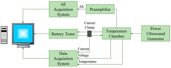 Battery material properties can be seen as a function of SOC and SOH. Wang et al. [80] first proposed a new active AE sensing technique for rapid co-estimation of battery SOC and SOH. Leveraging the alterations in battery material characteristics during charge–discharge cycles, power ultrasound is utilized to induce AE events, enabling AE transducers to actively detect a broader spectrum of battery state information across a wide frequency range. To evaluate the efficacy of the proposed active AE sensing technique for swift battery status monitoring, a specialized test system was constructed, incorporating a narrowband power ultrasonic transducer paired with a wideband AE sensor. Figure 12 is the schematic diagram of the designed test bench. It is composed of a host computer, a battery tester, a temperature chamber, a data acquisition system, an AE acquisition system, a preamplifier, an AE sensor, a power ultrasonic generator, an ultrasonic vibrator, a DC power supply, a current clamp, a bag battery, a thermocouple, a G clamp, etc.