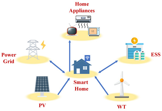 Increasing energy demand by households and businesses and the increase in the penetration of renewable energy resources (RERs) have drastically changed the energy landscape in recent years. As a result, home energy management systems (HEMSs) and smart grid (SG) technologies have been developed to diminish carbon emissions, reduce energy costs, and optimize energy usage [4]. Energy demand is on the rise, and generator capacity is limited, which could cause electricity prices to spike severely. Meanwhile, customers who bought and consumed energy with fixed prices can now adapt to time-varying prices by altering their load profiles and carrying out the smart HEMS. A HEMS is an important component of SG infrastructure, playing a significant part in the execution of demand side management (DSM) programs such as demand response programs (DRPs) and energy efficiency programs in smart homes. Using a two-way flow of electricity and data, DSM encourages end users to optimize their energy consumption. Likewise, it is integrated with HEMS so that time of use (ToU) tariffs can be transferred and energy consumption coordinated to meet the grid constraints and reliability requirements. In this regard, smart homes with shiftable loads have been identified as a promising opportunity for improving microgrid (MG) efficiency and its operations [5,6]. HEMS integrated with wind turbine (WT), photovoltaic (PV), and energy storage system (ESS) can significantly reduce carbon emissions, decrease energy consumption, and improve energy security [7]. Also, energy management can be revolutionized as RER technologies continue to develop.