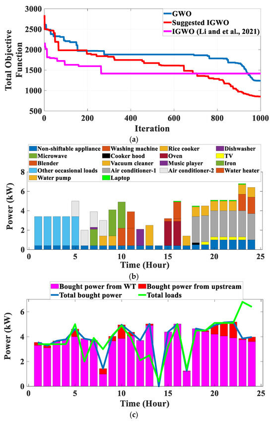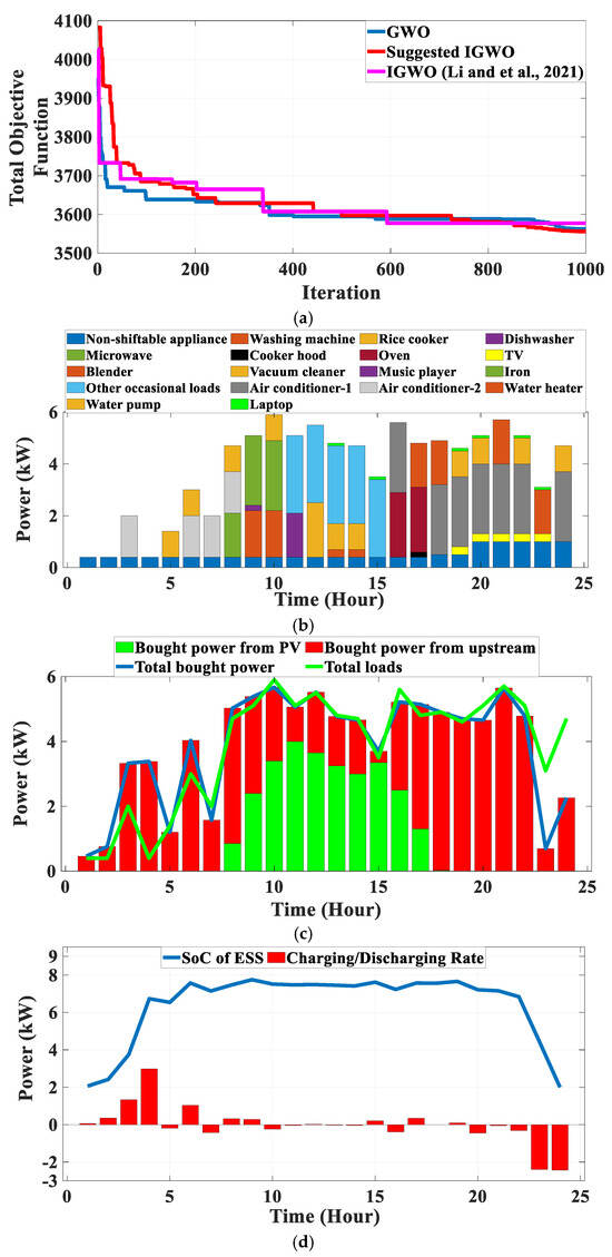 In this section, the suggested SHEM and IGWO are analyzed and validated by considering the energy price of PV, WT, and upstream grid, price of sold energy, energy consumption, and ESS for smart homes. The simulations are implemented for one day with a one-hour time step; hence, HEMS and appliance scheduling are considered in 24 intervals. The IGWO is used to solve the HEMS problem. The simulations are carried out on a 64-bit Intel (R) Core (TM) i7-4600 CPU at 2.1 GHz with 12 GB RAM.