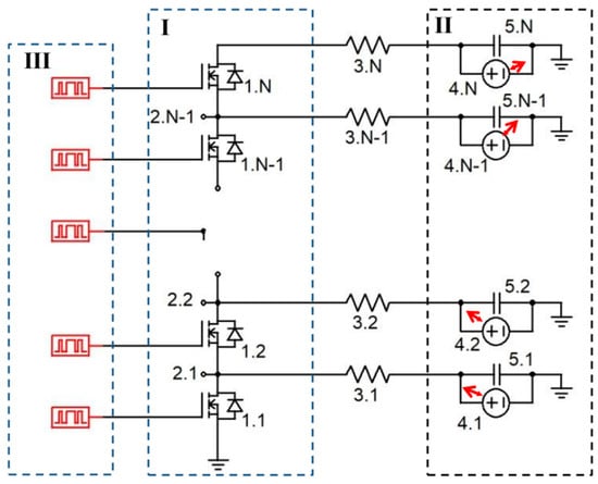 The flowchart of HV pulse generators includes three main units depicted as I, II, and III in Figure 1. Unit I consists of N transistors (1.1–1.N) connected by N-1 electrical contact (2.1–2.N-1) sequences. Unit II consists of N-regulated HV sources of power (4.1–4.N) shunted by N capacitors (5.1–5.N). Unit III controls the gates of transistors in N×MOSFET (N×IGBT or devices with cascode configuration [14]). N resistive loads (i.e., 3.1–3.N) of the N transistors (1.1–1.N) connect Units I and II.