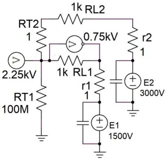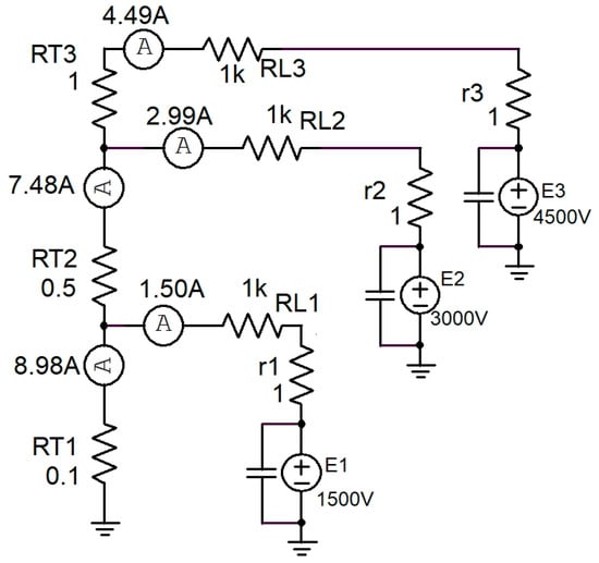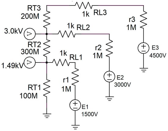 For the OFF state of new generators, the main interest is the voltage distribution on transistors. Figure 2 shows the equivalent circuit of a generator in OFF state. The sources of regulated HV power (E1, E2, and E3) have effective internal resistances, depicted as r1, r2, and r3. These resistors may be about 1 MΩ. In these conditions, the E sources with voltages of about 5 kV can produce a constant current of ~5 mA. Datasheets typically provide zero gate voltage drain currents (IDSS) for Umax, allowing for the estimation of transistor resistances (RT1, RT2, and RT3) in OFF state. For example, STP4N150 transistors (Umax = 1.5 kV) have IDSS = 10−5 A [9], and OFF-resistors are ~108 Ω.