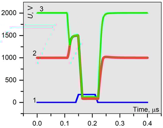 The simulation-switching voltage waveforms for the new generator with 2×MOSFET stack. 1: pulses on the gates of transistors (blue, 10×); 2: SCT1000N170 transistor at the T1 site (red); 3: G2R1000MT33J transistor at the T2 site (green).